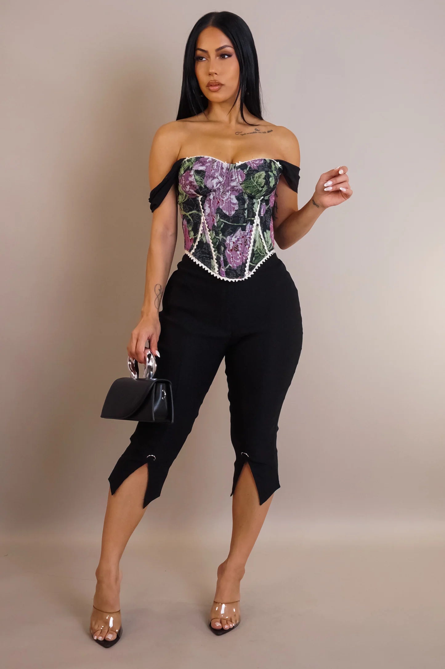 Sleek, tailored, and unapologetically chic. Designed to elevate any outfit, these capris feature a cropped silhouette with bold front slits. Accented with metal ring hardware for a modern fashion forward edge.